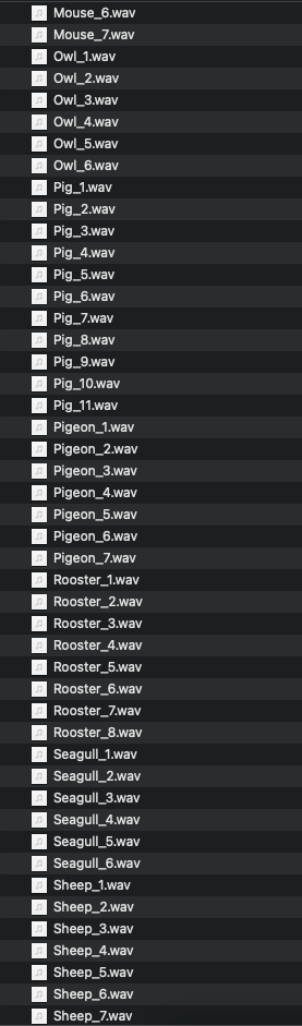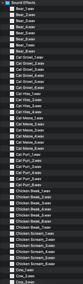 Animal Sound Effects pack contains 21 animal sounds all ready to use. Drag and drop a total of 193 individual animal sound effects to your project with ease. Animals included are turkeys, sheep, seagulls, rooster, pigeon, pig, owl, mouse, monkey, lion, jaguar, horse, elephant, frog, duck, dog, chicken, cow, cricket, cat and bear.