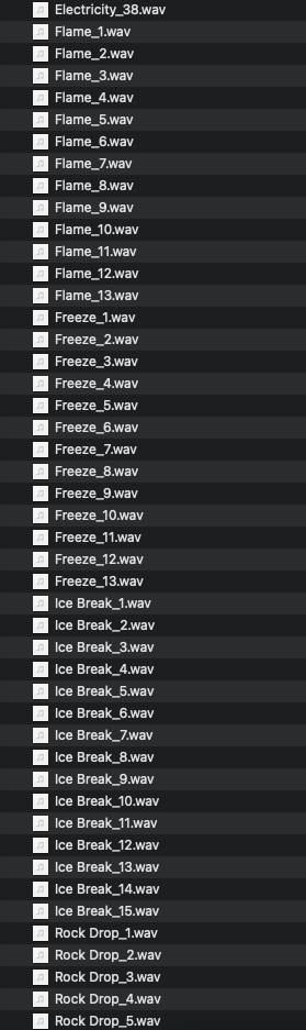 Elemental Sound Effects pack contains a total of 182 individual ready to use sounds. Includes 6 elements such as fire, water, ice, lighting , wind and earth. These are general element sound effects like burning, rock dropping, wind howling, electric sparks and so on.