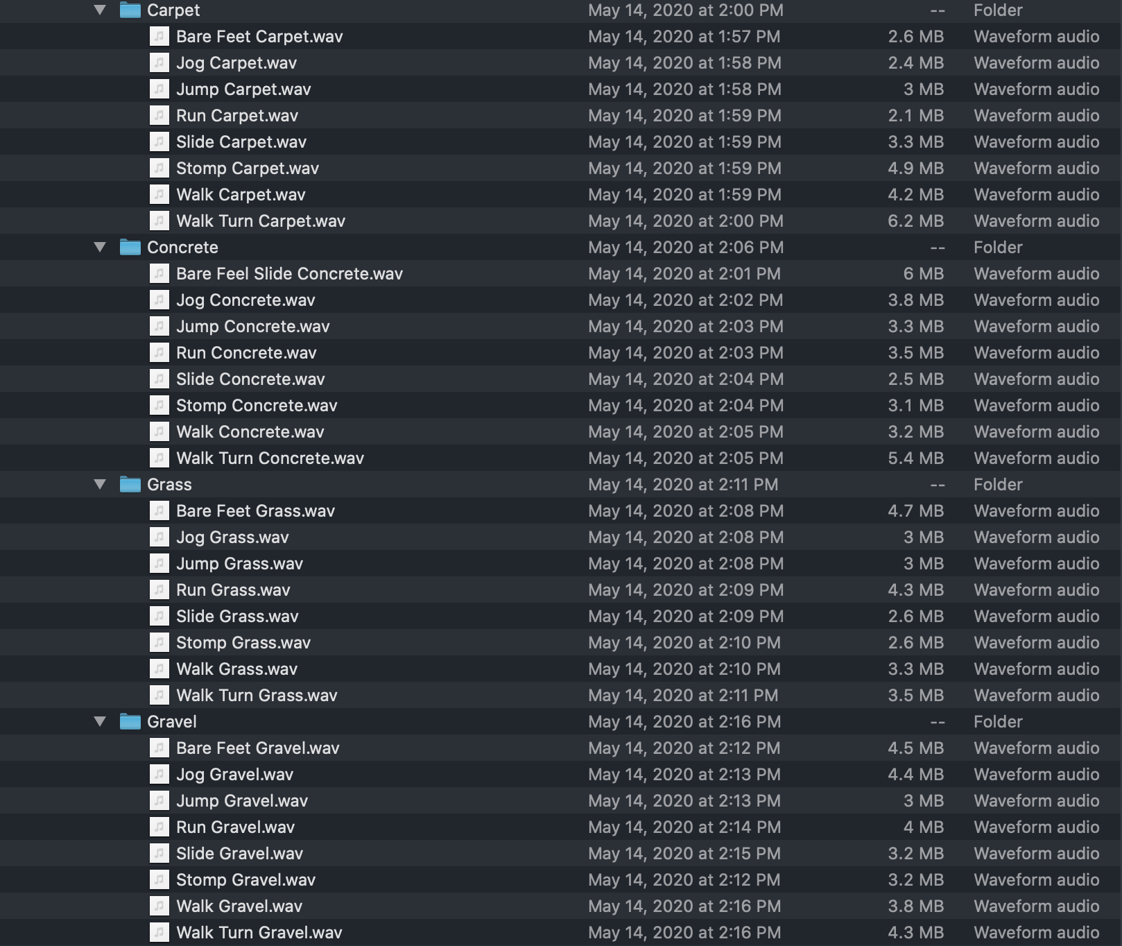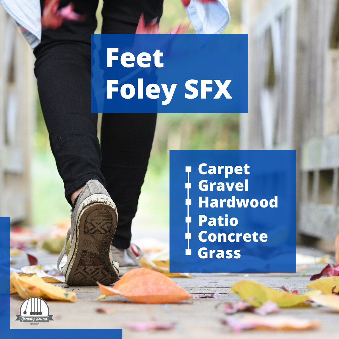 The ultimate foley sound effects for video editing and video game development. This footsteps sound effect pack features 48 samples on 6 surfaces, each with 8 different walking styles. Surfaces include carpet, gravel, hardwood, patio/wood deck, concrete and grass. Style include running, walking, shuffling jumping, stomping, walk and turn, jogging and bare feet.