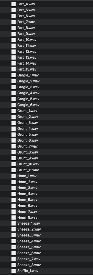 Human Sound Effects pack contains 114 foley sound effects that we as humans can make. Perfect for creating a realistic project such as a video game of video. This human sound effects pack includes breathing, coughing, spitting, sneezing and more.