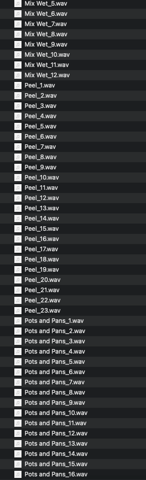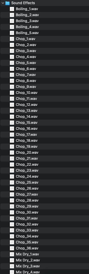Foley kitchen sound effects ready to use for your project. Includes 138 individual foley sound effects such as chopping, mixing, boiling, sizzling, peeling, pouring and pots and pan sounds.