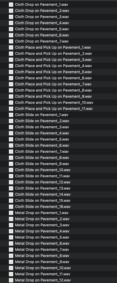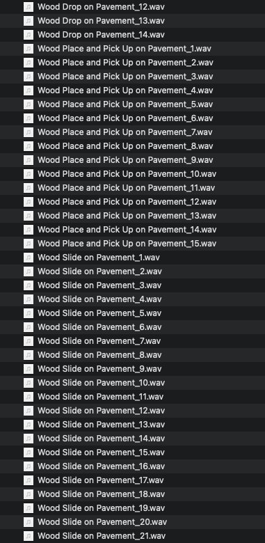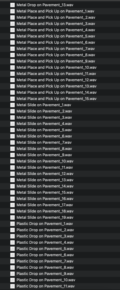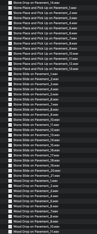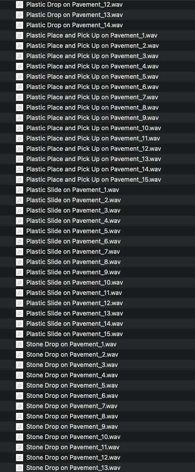 Objects on Pavement sound pack contains 223 individual foley sound effects. Includes 5 objects (wood, metal, plastic, cloth and stone) interacting with a pavement surface. Object movement includes dropping, placing, picking up and sliding.